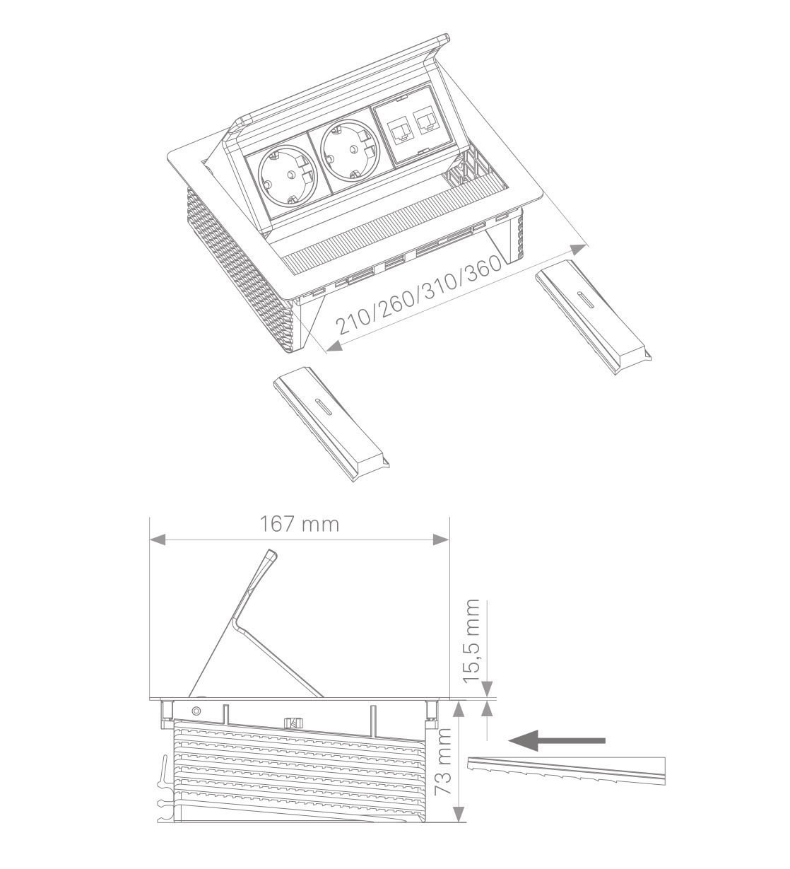 Когда крышка закрыта, видна лишь аккуратная панель из нержавеющей стали. Достаточно лёгкого нажатия — и модульная панель плавно поднимается над поверхностью стола. После использования достаточно снова слегка нажать, чтобы скрыть розетки и кабели под крышкой. Механизм «Push-to-Open» обеспечивает простое и надёжное открывание без усилий.